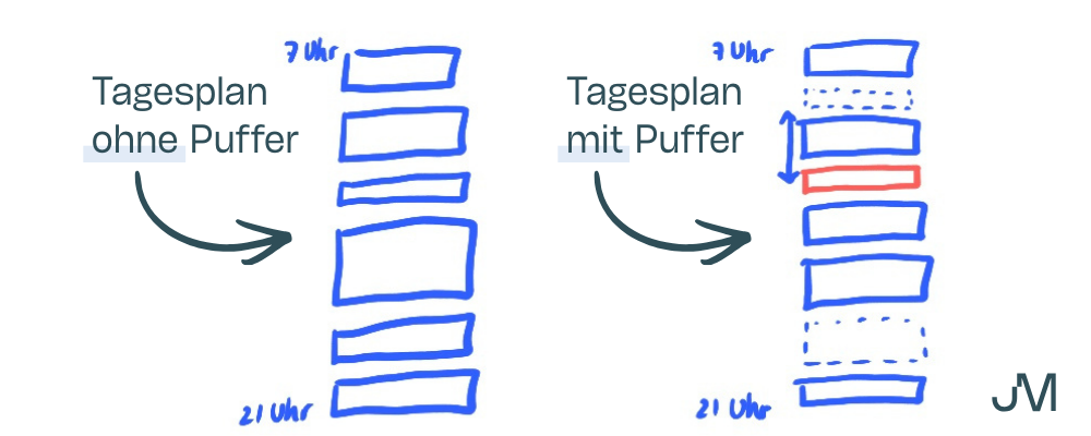 Hier auf der Grafik habe ich mal versucht, es darzustellen. Bei dem Tagesplan ohne Puffer sind alle Blöcke nacheinander. So, wie es oft im Kalender steht. Bei dem Tagesplan mit Puffer sind ein paar Blöcke optional (gestrichelt), einer ist flexibel hin und her schiebbar (Pfeil) und es ist Zeit eingeplant, die rein als Puffer dient (roter Kasten). So wird der Tagesplan viel anpassbar, falls Unvorhergesehenes passiert.